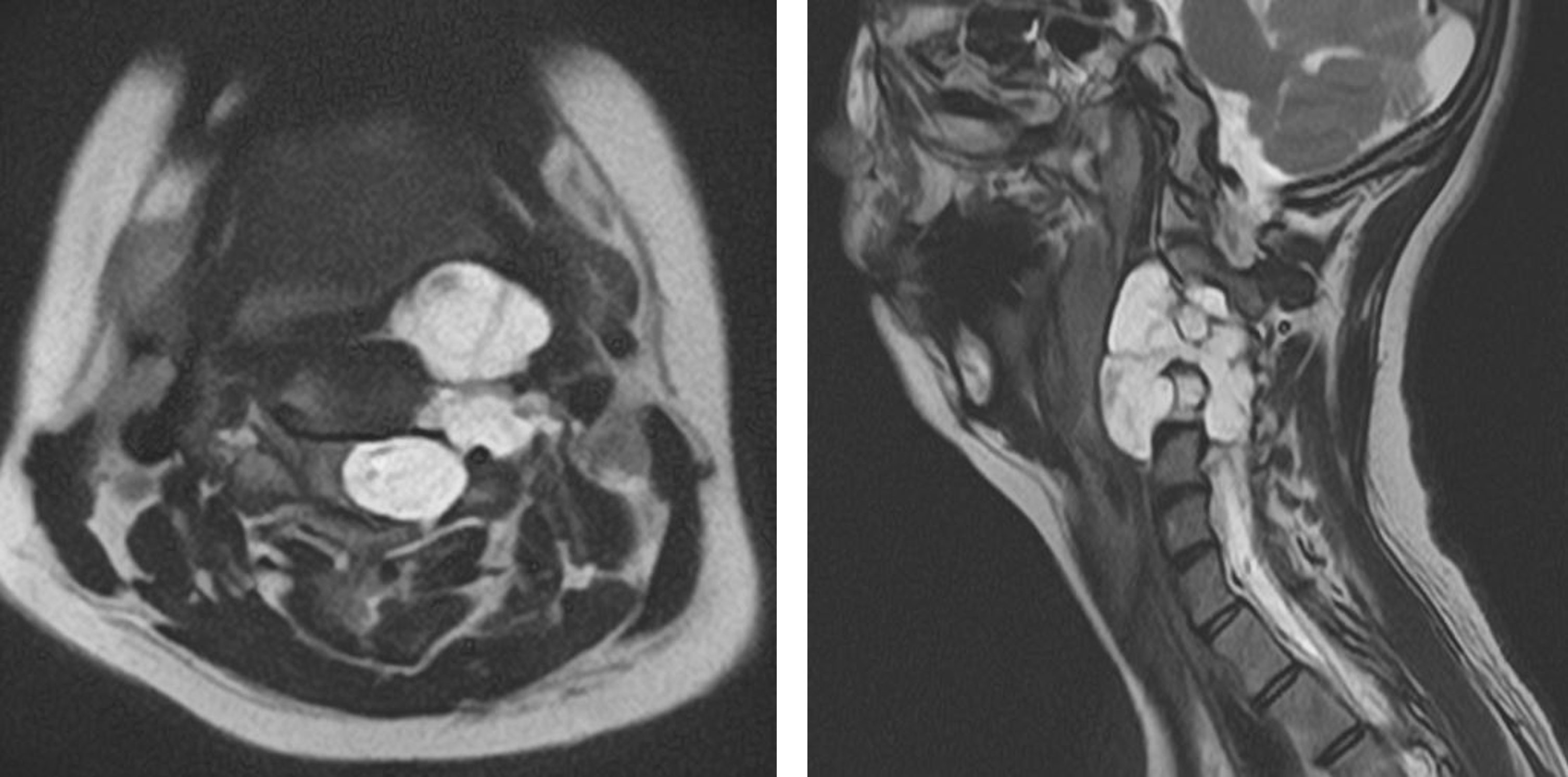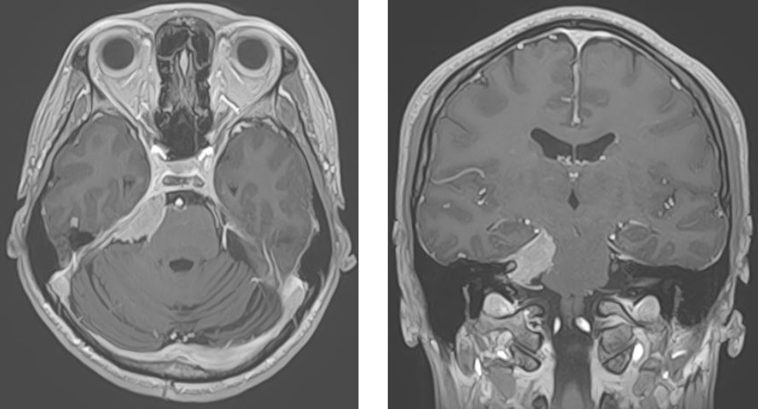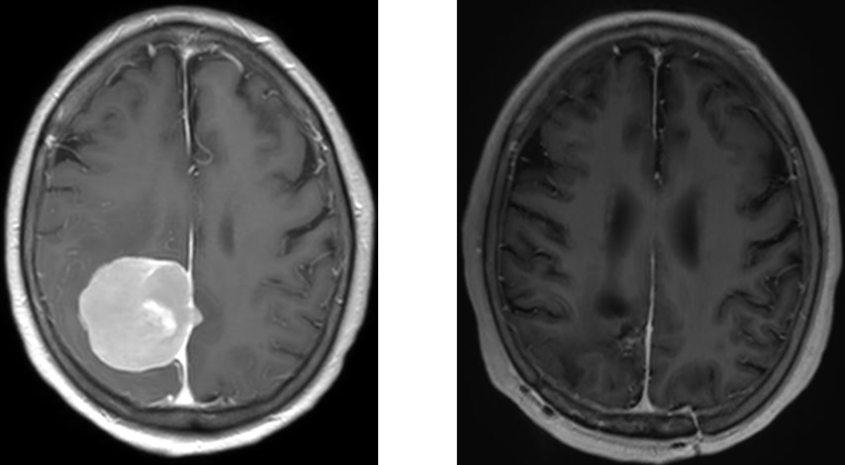 髄膜腫は原発性脳腫瘍のうち最も頻度の高いものです。緩徐な増大を来し無症状であることも多く、脳ドック検査などで偶然発見される場合もあります。治療後も再発や転移を起こさない良性の経過を来すものが多いですが、一部に細胞分裂が速かったり、何度も再発を来すような悪性度の高いものが存在しますので注意が必要です。小さく進行がゆっくりであるものは経過観察を行うことが一般的です。摘出の難易度を左右する要因は、腫瘍の部位、大きさ、硬さ、栄養血管の豊富さなどがあげられます。腫瘍が大きい場合は、周囲の脳や神経、正常血管と癒着している場合があります。頭蓋内の深部に存在するものは手術の難易度が高い場合があります。手術は血流が多い症例もあり、術前に血管内治療で栄養血管を塞栓した方が手術時の出血量を減らせたりすることが多く、この方法を取り入れています。