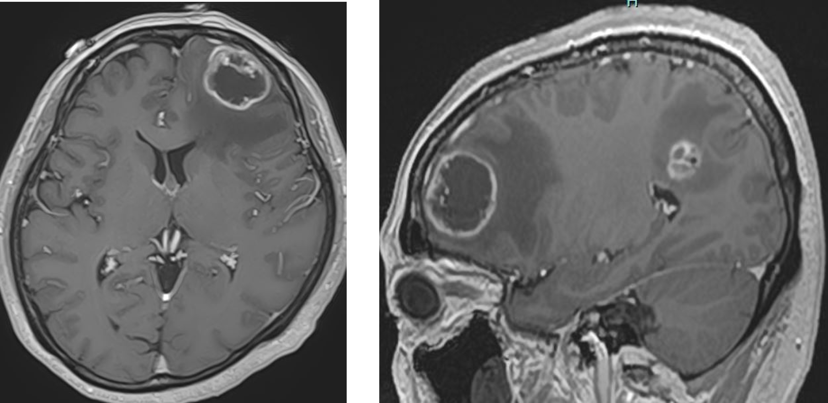 神経膠腫の中でも、膠芽腫は最も悪性度が高い腫瘍です。膠芽腫には、初発時から膠芽腫の所見を呈するもの(一次性膠芽腫)と、星細胞腫などから悪性転化して生じたもの(二次性膠芽腫)の2種類があります。大脳半球に発生することが多く、浸潤性が強い腫瘍で脳の神経線維の走行に沿って進展していきます。症状は頭痛のほか、けいれん発作、言語障害や運動麻痺などの他、性格変化、認知症などが生じることもあります。早いものは週単位で症状がどんどん悪化していきます。治療のはじめは手術で、安全な範囲内で可及的に最大限の摘出を行うことが薦められます。手術後の後療法として、放射線・テモゾロミドを用いた化学療法を行っています。その他、維持療法中の電場療法についても外来で行っております。
