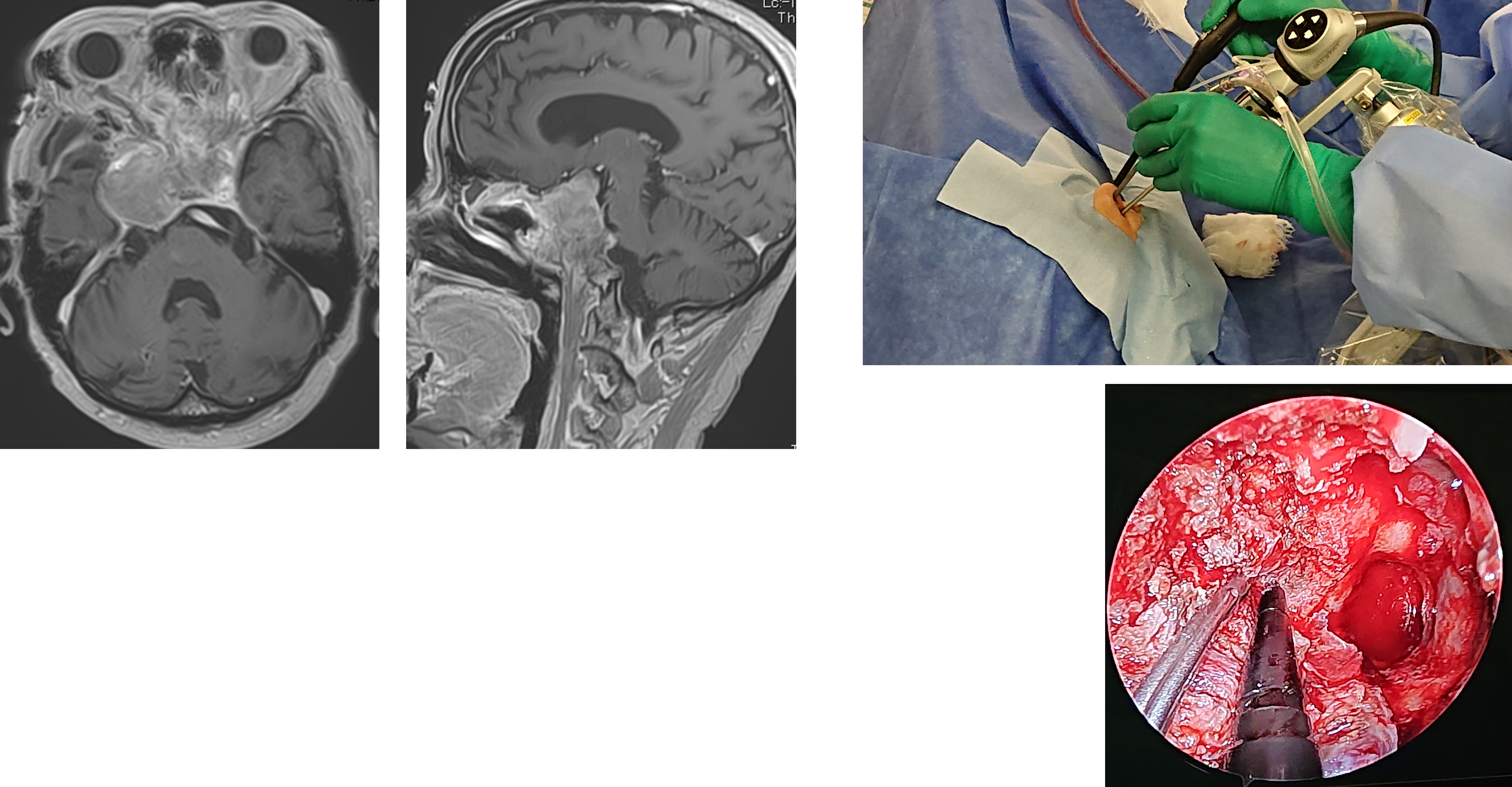 頭蓋底腫瘍は頭蓋骨の底部に発生する腫瘍の総称です。腫瘍が脳の深部にあること、 また多くの重要な神経組織や血管などが近くにあるため、危険性が高く、治療成績は思わしくありませんでした。しかし近年では、顕微鏡に加えて内視鏡を用いた手術手技が開発され、手術成績はかなり向上してきています。当院では、手術の部位により、外視鏡と顕微鏡を組み合わせた手術手技を行っております。低侵襲で、かつ最大限の摘出を目的とする取り組みを行っております。下垂体を含むトルコ鞍近傍に発生する腫瘍が多いですが、中頭蓋窩、後頭蓋窩に発生する腫瘍性病変に対しても良好な治療成績を得ております。